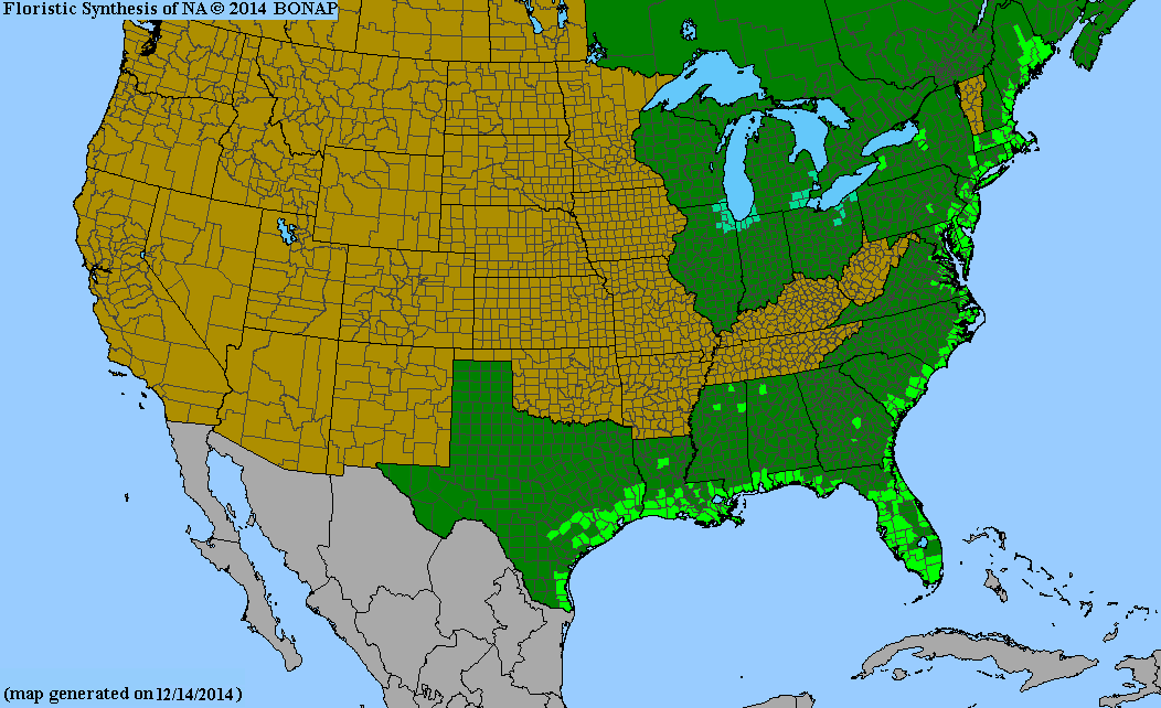 Present in the coastal plain. Absent from the piedmont and mountains.